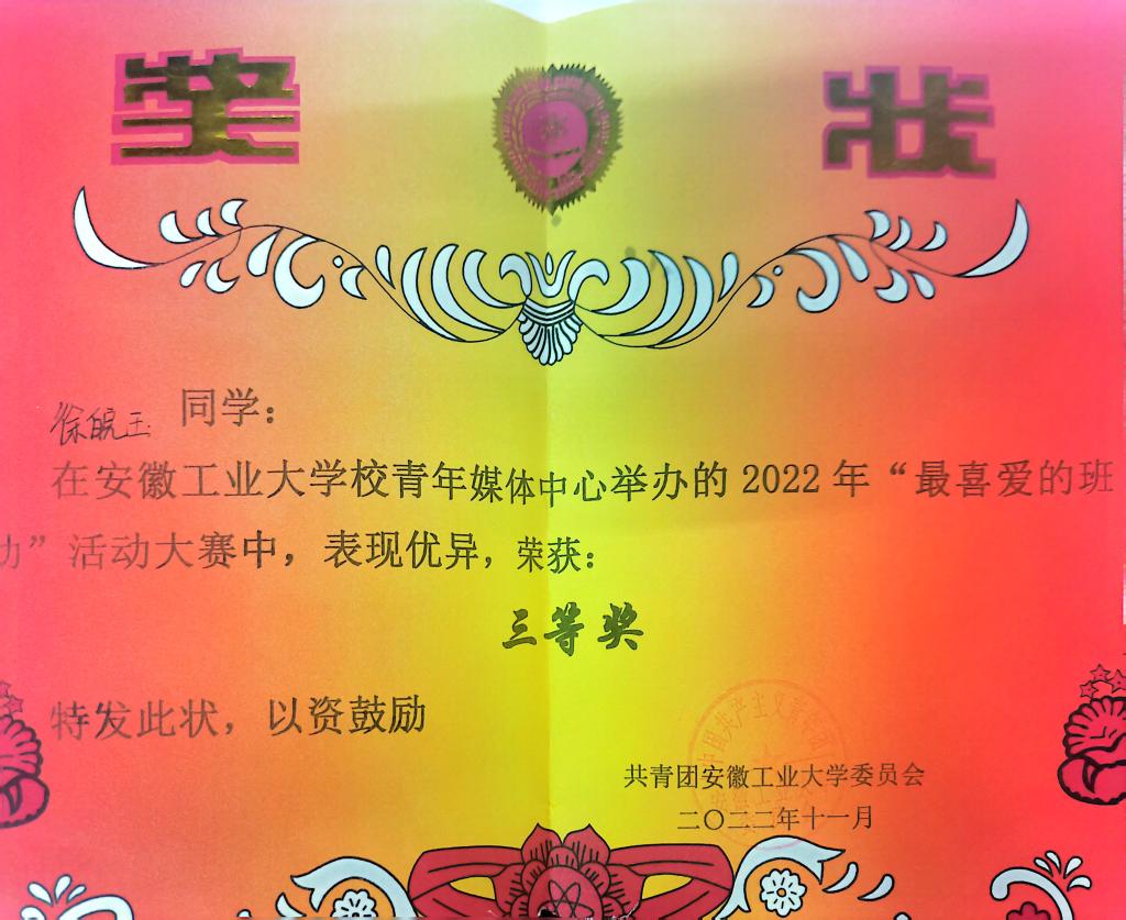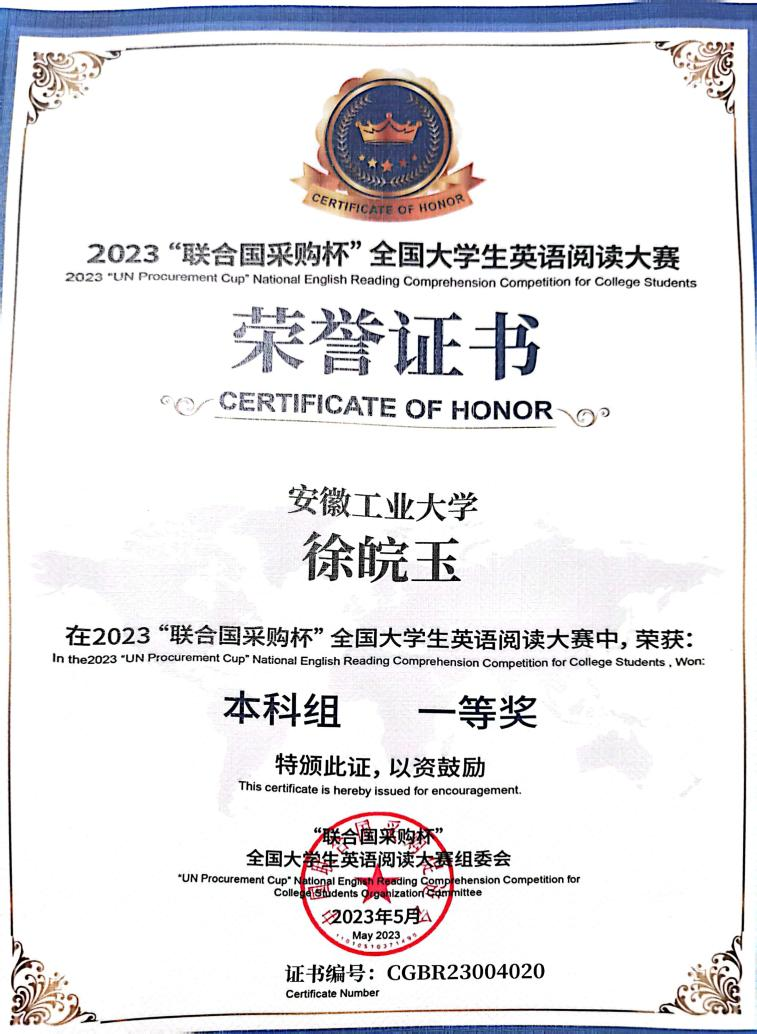 三年来,徐皖玉同学深知专业知识是实现理想的基石,始终以严谨的态度对待学习,综合成绩专业第一。曾获国家奖学金、校特等奖学金、东铭奖学金、中天钢铁奖学金,获校“三好学生标兵”、“三好学生”等荣誉称号,获:2020年“外研社杯”英语阅读大赛校赛一等奖,2021年“外研社杯”英语阅读大赛校赛一等奖,2023年“联合国采购杯”全国大学生英语阅读大赛本科组一等奖、2023年全国大学生英语竞赛二等奖,2023年第二届全国大学生英语语法挑战赛中国区三等奖等。