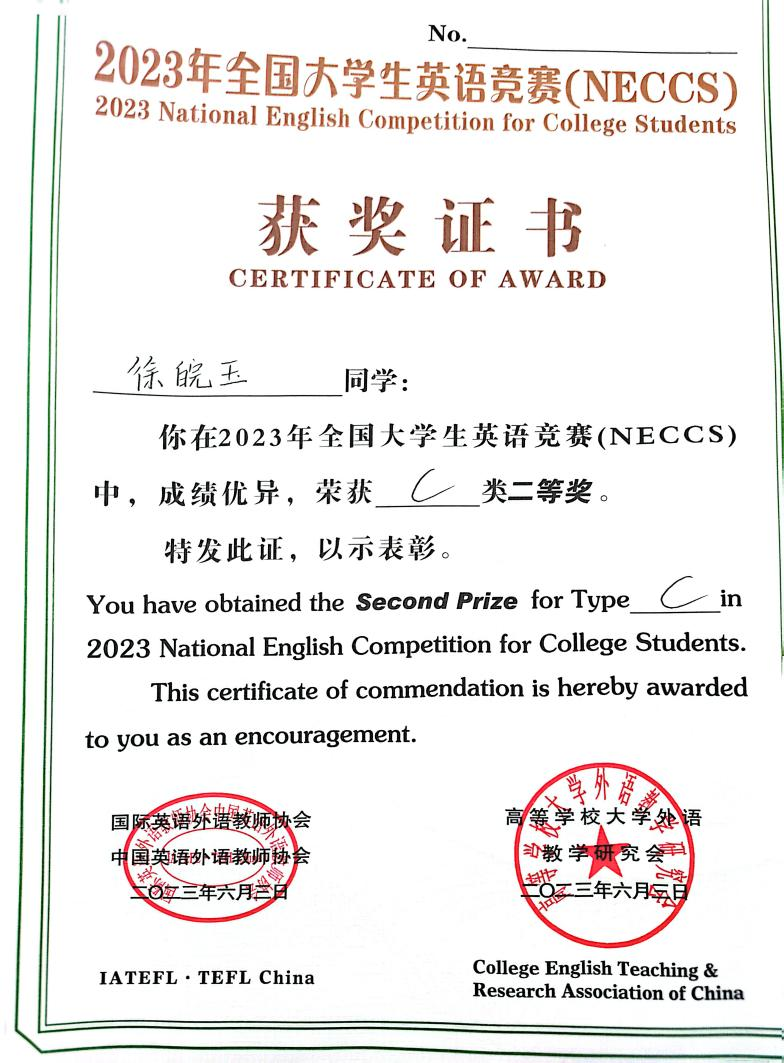 她积极参加科研项目与学科竞赛,累计获得国家级等各级奖项若干。在参加2023年全国大学生英语竞赛的过程中,她认真准备,进行英语奥林匹克相关知识的学习,最终取得了二等奖的好成绩。一直以来,她对英语学习有着浓厚的兴趣,平时注重培养自己的英语学科素养,获得了2023年联合国采购杯全国大学生英语阅读大赛本科组一等奖、2023年第二届全国大学生英语语法挑战赛中国区三等奖、全国大学生英语能力大赛优秀奖等多项国家级奖项。她对自己要求严格,自学能力强,在英语学科学习过程中坚持不懈,培养起过硬的学科素养与能力。