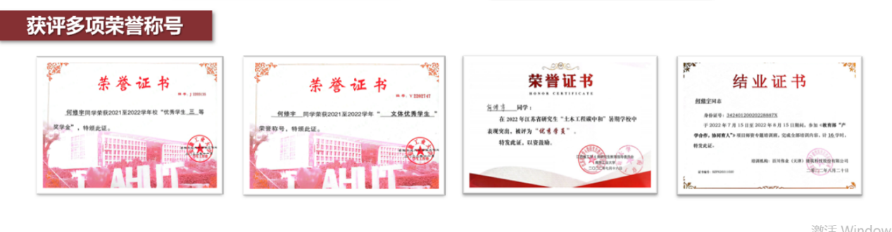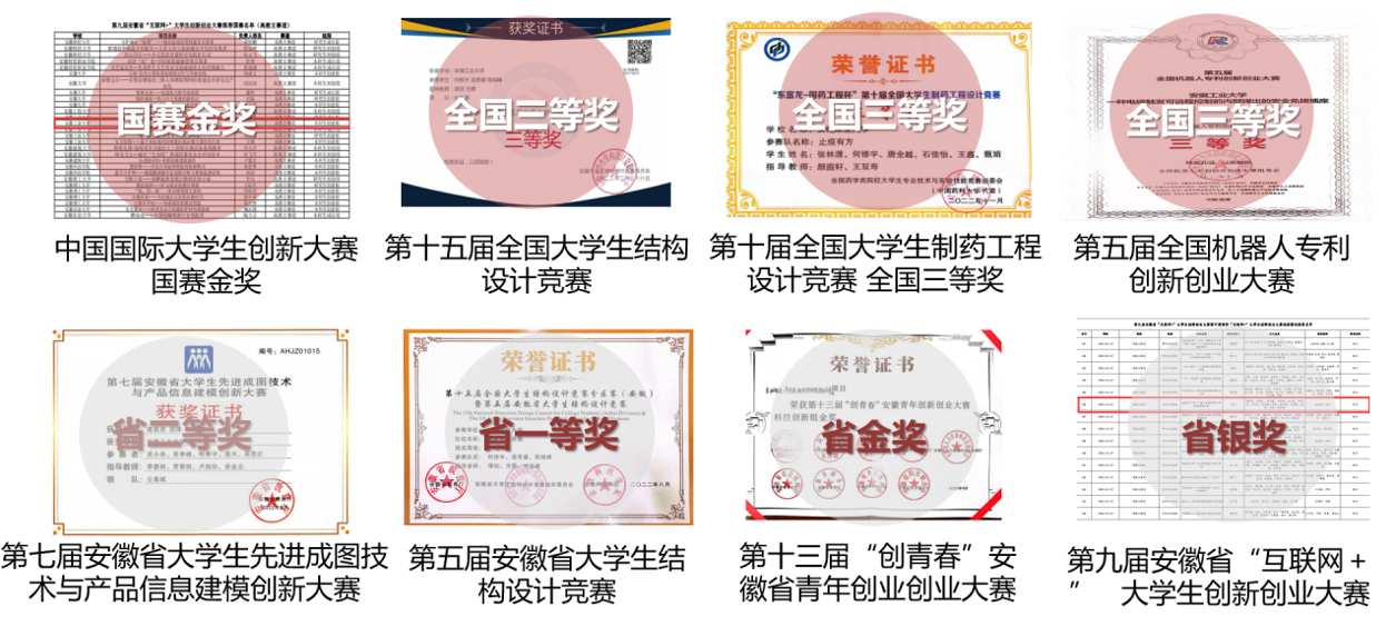 他积极参加学科竞赛,本科期间获得了“中国国际大学生创新大赛”全国金奖(创造我校建校以来在该赛事的最好成绩)、“第十五届全国大学生结构设计竞赛”全国三等奖、 “第十届全国大学生制药工程设计竞赛”全国三等奖、“第五届全国机器人专利创新创业大赛”全国三等奖、“第九届安徽省互联网+大赛”安徽省金奖”、“第五届安徽省结构设计竞赛”安徽省一等奖、“第六届安徽省大学生先进成图技术与产品信息建模创新大赛”安徽省三等奖、“第七届安徽省大学生先进成图技术与产品信息建模创新大赛”安徽省三等奖、第十一届华东区大学生CAD应用技能竞赛 华东区三等奖的优异成绩。