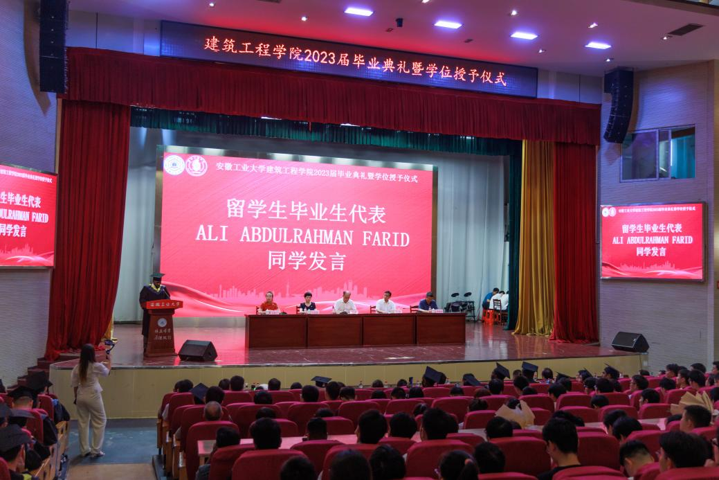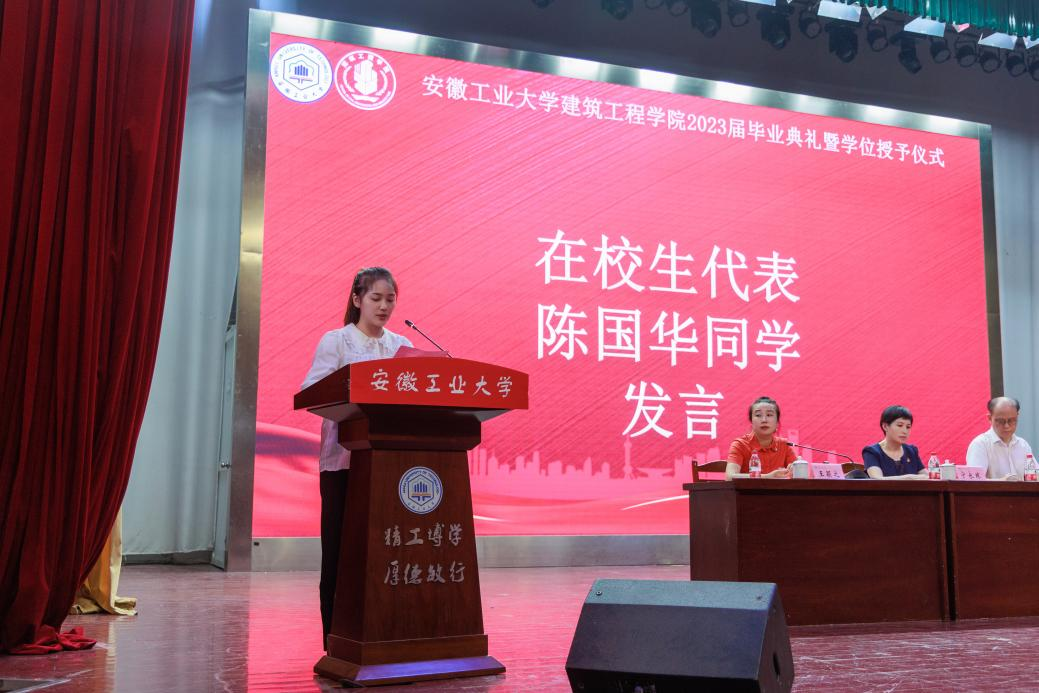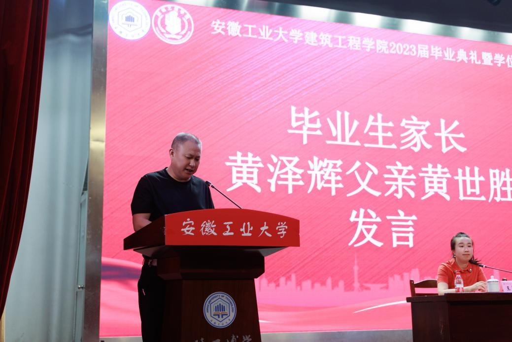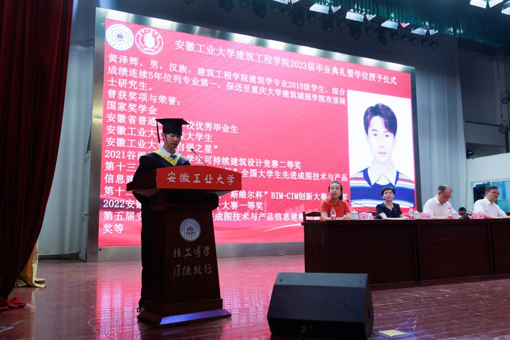 典礼上,本科生代表2018级建筑学专业黄泽辉同学回顾了在工大五年的求学时光,积极践行“今天我以母校为荣、明天母校以我为荣”的青春誓言,努力书写精彩人生华章。研究生代表2020级冶金环境安全工程专业胡俊杰同学结合自身在工大校园学习、科研的时光表达对于母校的热爱之情。留学生代表ALI ABDULRAHMAN FARID由衷感谢母校的培养,在学习过程中学会了勇敢与坚强、自信与务实。在校生代表2020级建筑学专业本科生陈国华向即将毕业的学长学姐们给予的帮助表达了感谢,并表述将努力用自身的青春和智慧续写辉煌的篇章。毕业生家长代表黄世胜先生向学校及足球赛比分