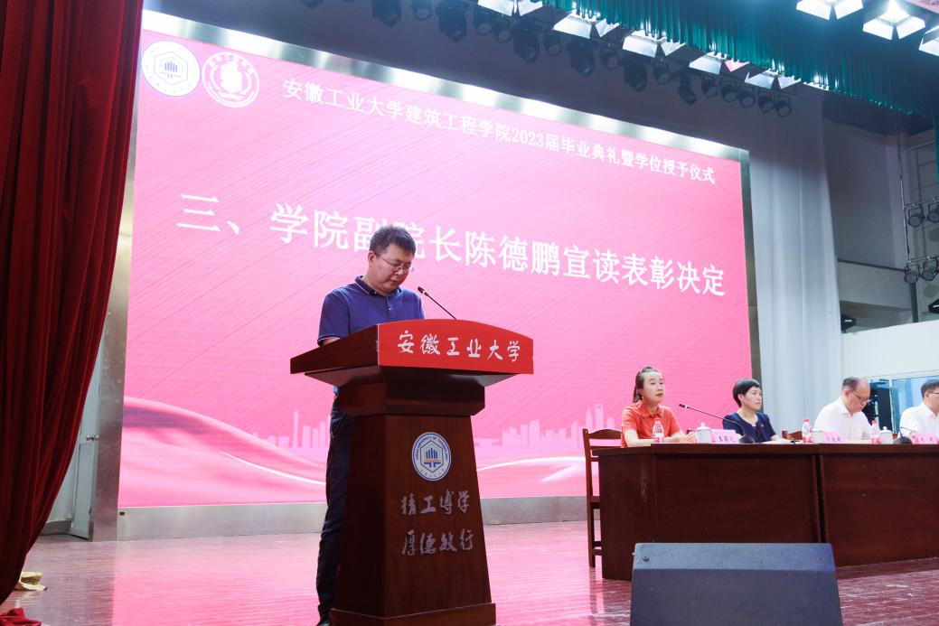 2023届毕业生整体情,副院长陈德鹏宣读了2023年安徽省普通高等学校优秀毕业生、校优秀毕业生、毕业生考取研究生录取率优秀班级、校友联络员名单。