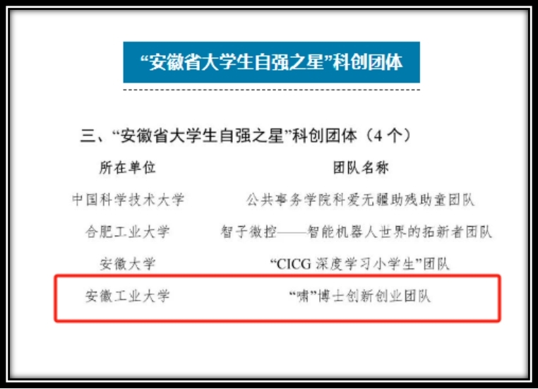 “啸”博士创新创业团队荣获“安徽省大学生自强之星”科创团体,并被安徽省推荐成为“中国大学生自强之星”候选科创团体。