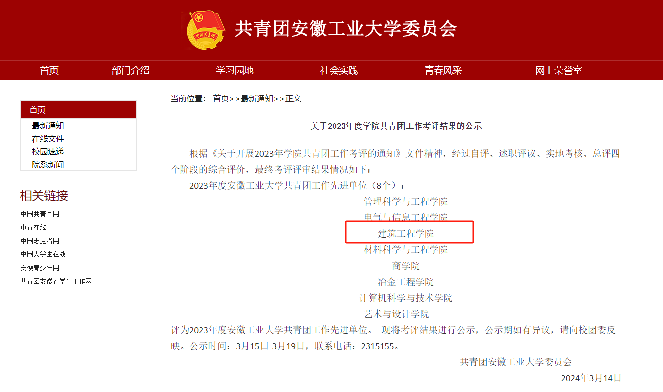 团委在学校共青团工作考评中荣获2023年度安徽工业大学共青团工作先进单位。本次获评是继2022年度获校共青团工作先进单位后连续第二年获得的殊荣。